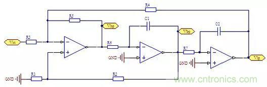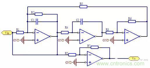 原始信號減去帶通信號就稱為帶阻信號了,因此再增加一個(gè)運(yùn)放就可以實(shí)現(xiàn)帶阻型濾波器。