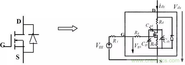 實(shí)際的功率MOSFET 可用三個(gè)結(jié)電容,三個(gè)溝道電阻,和一個(gè)內(nèi)部二極管及一個(gè)理想MOSFET 來(lái)等效。三個(gè)結(jié)電容均與結(jié)電壓的大小有關(guān),而門極的溝道電阻一般很小,漏極和源極的兩個(gè)溝道電阻之和即為MOSFET 飽和時(shí)的通態(tài)電阻。