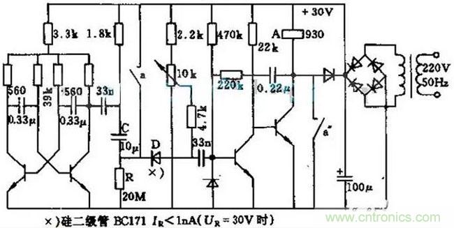 本文介紹的是一款延遲吸合繼電器開關控制電路圖。如下圖所示,在接通電源后,時間流程開始電容C首先放電而后通過20M從點電阻充電。