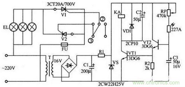 白天在較強光照下,光導管227A(一種光敏電阻)兩端阻值很小,約20~50kΩ,晶體管VT2獲得基極電流而導通,VT1從R2上得到正偏電壓也導通,繼電器線圈KA得電,繼電器的常閉觸電②、③斷開,兩只晶閘管V1和V2沒有觸發(fā)信號而不導通,因而燈泡EL不亮。