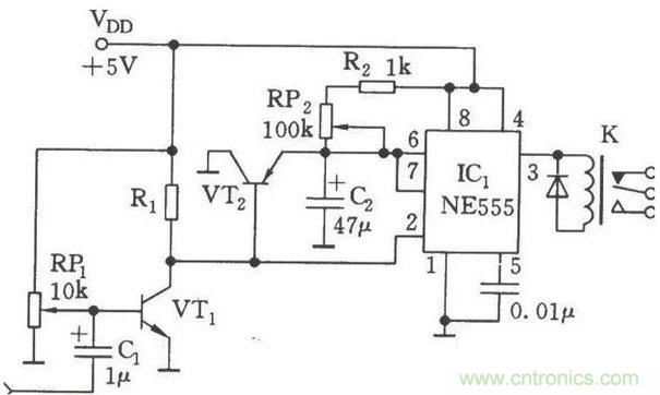 如下圖所示,該電路由聲音檢測電路和單穩(wěn)觸發(fā)電路組成,執(zhí)行元件為繼電器.VT1完成輸入音頻信號的放大,當有信號來時,使555置位,K吸合。同時,VT2導通,C2上的電荷通過555內(nèi)部的放電管和VT2迅即放完。聲音過后,VT1、VT2截止,C2通過R2、RP2對其充電,單穩(wěn)態(tài)電路的暫穩(wěn)時間td=l.1(R2 RP2)C2,延時范圍在0.05~0.5秒,可通過RP2來調(diào)節(jié)。