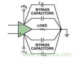電源端接地:這種方法在大多數(shù)情況下都是最有效的,采用多個(gè)并聯(lián)電容器將運(yùn)算放大器的電源引腳直接接地。一般說(shuō)來(lái)兩個(gè)并聯(lián)電容就足夠了——但是增加并聯(lián)電容器可能給某些電路帶來(lái)益處。