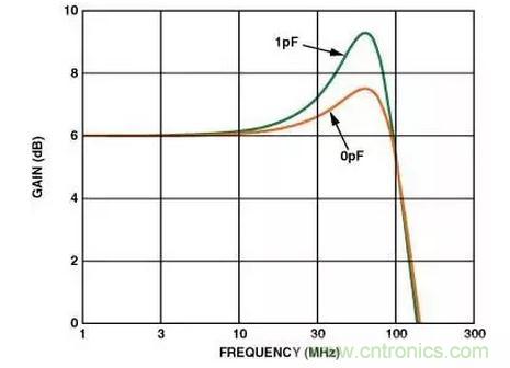 在高速電路中,很小的值就會(huì)影響電路的性能。有時(shí)候幾十個(gè)皮法(pF)的電容就足夠了。相關(guān)實(shí)例:如果在反相輸入端僅有1 pF的附加寄生電容,它在頻率域可以引起差不多2 dB的尖脈沖(見(jiàn)圖4)。如果寄生電容足夠大的話,它會(huì)引起電路的不穩(wěn)定和振蕩。