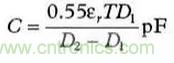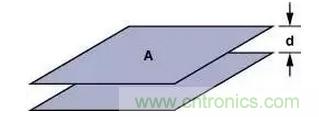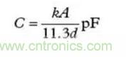 當(dāng)尋找有問(wèn)題的寄生源時(shí),可能用得著幾個(gè)計(jì)算上述那些寄生電容尺寸的基本公式。公式(1)是計(jì)算平行極板電容器(見(jiàn)圖5)的公式。