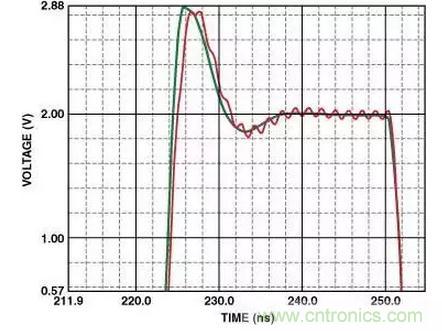 圖7中的振蕩示出了高速運(yùn)算放大器同相輸入端長(zhǎng)度為2.54 cm的印制線的影響。其等效寄生電感為29 nH(10-9H),足以造成持續(xù)的低壓振蕩,會(huì)持續(xù)到整個(gè)瞬態(tài)響應(yīng)周期。圖7還示出了如何利用接地平面來(lái)減小寄生電感的影響。