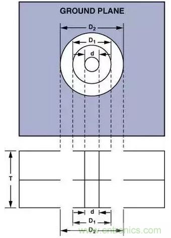 εr表示PCB材料的相對(duì)磁導(dǎo)率。T表示PCB的厚度。D1表示環(huán)繞通孔的焊盤直徑。D2表示接地平面中隔離孔的直徑。所有尺寸均以cm為單位。在一塊0.157 cm厚的PCB上一個(gè)通孔就可以增加1.2 nH的寄生電感和0.5 pF的寄生電容;這就是為什么在給PCB布線時(shí)一定要時(shí)刻保持戒備的原因,要將寄生效應(yīng)的影響降至最小。
