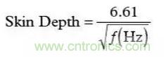 在高頻段,必須考慮一種稱為“趨膚效應(yīng)”的現(xiàn)象。趨膚效應(yīng)會(huì)引起電流流向?qū)Ь€的外表面——結(jié)果會(huì)使得導(dǎo)線的橫截面變窄,因此使直流(DC)電阻增大。雖然趨膚效應(yīng)超出了本文討論的范圍,這里還是給出銅線中趨膚深度(Skin Depth)的一個(gè)很好的近似公式(以cm為單位):