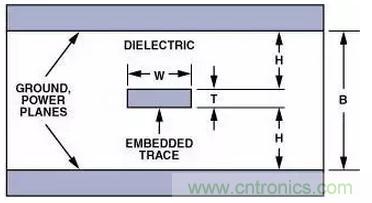 H表示從接地平面到信號(hào)印制線之間的距離,W表示印制線寬度,T表示印制線厚度;全部尺寸均以密耳(mils)(10-3英寸)為單位。εr表示PCB材料的介電常數(shù)。