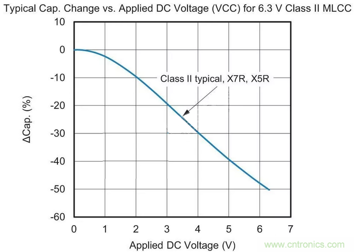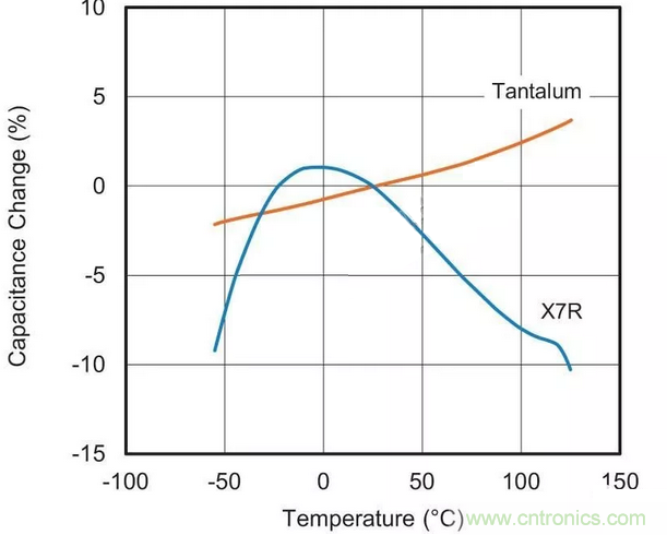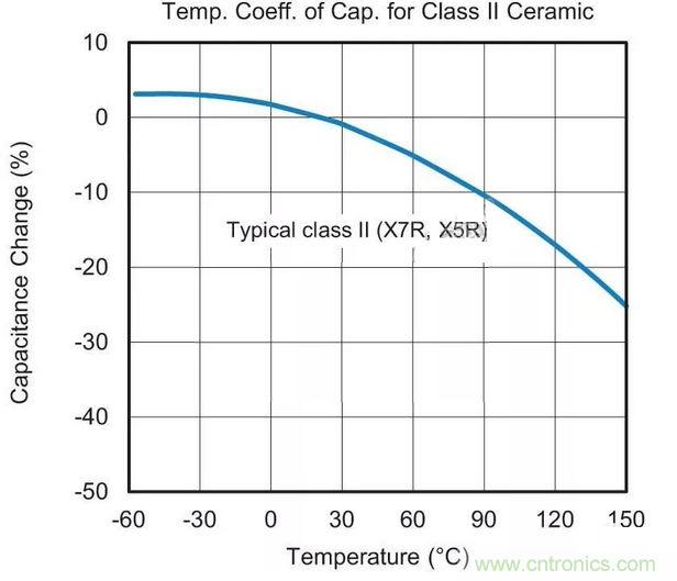 用于替換最可能的MLCC候選者采用“II類(lèi)”電介質(zhì)材料。這種II類(lèi)陶瓷(通常為X7R或X5R)的容值會(huì)在溫度范圍內(nèi)變化,這種特征稱(chēng)為電容溫度系數(shù)(TCC),參見(jiàn)圖1。