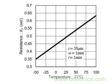 因此,當3A電流在25°C時流通PCB表面上銅時,電壓降約24.5mV。然而,溫度上升至100℃時,電阻值增加29%,電壓降變?yōu)?1.6mV。