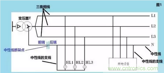 我們再來看圖1。圖1中的中性線發(fā)生了斷裂,于是在斷裂點的前方,中性線的電壓依舊為零,但斷裂點的后方若三相平衡時,它的電壓為零;但若三相不平衡,則斷裂點后方的中性線電壓會上升,最高會升到相電壓。