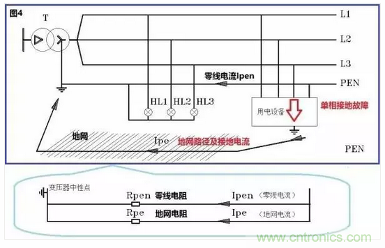 再看圖3,我們發(fā)現(xiàn)保護性中性線PEN中采取多點接地的方法,以避免出現(xiàn)保護性中性線斷裂點后部電壓上升的情況。
