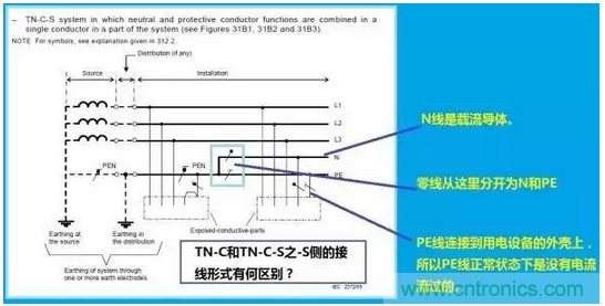 知曉這幾個概念后,我們來看看IEC給出的有關(guān)TN-C和TT系統(tǒng)的原圖。注意,這兩幅圖是不容置疑的,是有關(guān)接地系統(tǒng)的權(quán)威解釋。