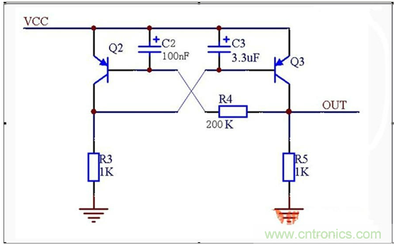 C2和c3很重要,在自鎖后,重啟電路就靠這兩個電容,否則啟動失敗。原理是上電時,電容兩端電壓不能突變,C2使得Q2基極在上電瞬間保持高電平,使得Q2不導(dǎo)通。C3則使得上電瞬間Q3基極保持低電平,使得Q3導(dǎo)通Vout有電壓。這樣R5位高電平,鎖住導(dǎo)通。