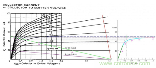 這里理解起來有些抽象,那我就具體的畫個圖,就很好理解了。在三極管截止的時候CE兩端的電壓是最大的,我們設(shè)為4.5V,在IB逐漸加大的過程中,VCE在逐漸變小,而飽和狀態(tài)下的Ic是由RC決定的,請看圖: