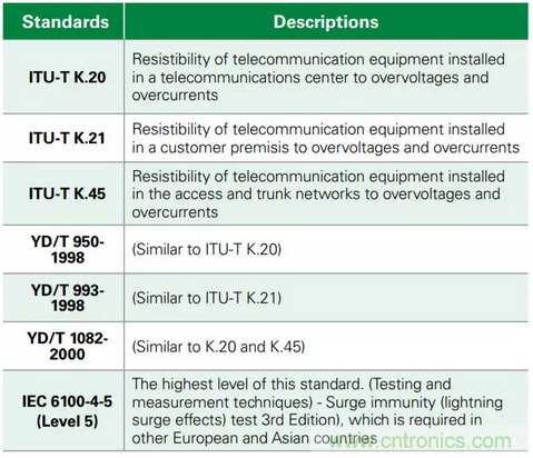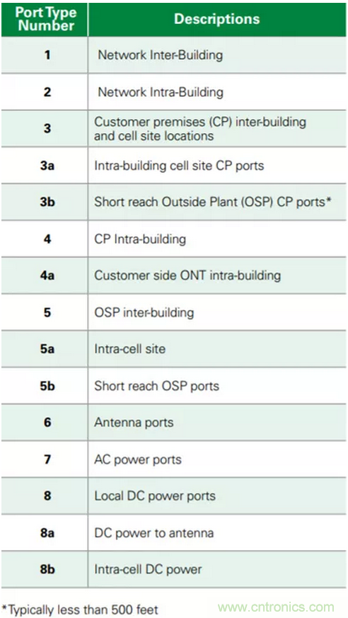 在美國,電信公司在網(wǎng)絡側安裝設備的電路保護(例如,安裝光纖網(wǎng)絡終端單元或ONT的附近機柜中)必須符合NEBS(網(wǎng)路設備建設系統(tǒng))設計指南,這反過來可能需要符合GR-1089第6期端口類型3浪涌。由于這些回路很短,端口類型可被指定為類型3a / 5a。每個供應商應界定其自身的防雷電要求。端口類型3是這類設備中的最嚴重情況。欲了解有關端口類型的更多信息,請參見表2。