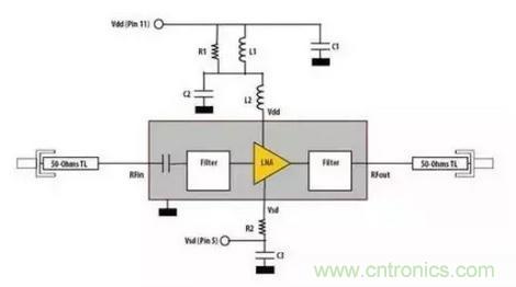 許多集成了線性線路的RF芯片對(duì)電源的噪音非常敏感,通常每個(gè)芯片都需要采用高達(dá)四個(gè)電容和一個(gè)隔離電感來(lái)確保濾除所有的電源噪音。一塊集成電路或放大器常常帶有一個(gè)開漏極輸出,因此需要一個(gè)上拉電感來(lái)提供一個(gè)高阻抗RF負(fù)載和一個(gè)低阻抗直流電源,同樣的原則也適用于對(duì)這一電感端的電源進(jìn)行去耦。