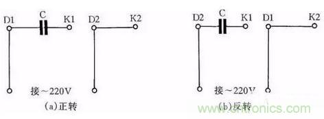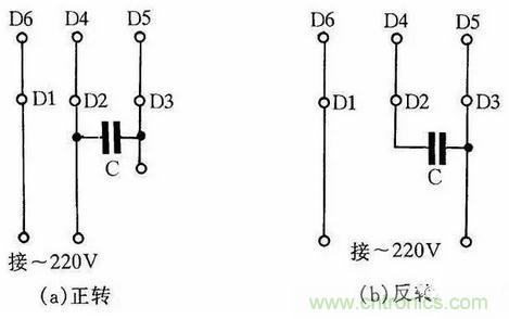 圖247為IDD5032型單相電容運(yùn)轉(zhuǎn)電動(dòng)機(jī)接線方法。其功率為60W,電容選用耐壓500V、容量為4μF的產(chǎn)品。圖3(a)為正轉(zhuǎn)接線,圖3(b)為反轉(zhuǎn)接線。