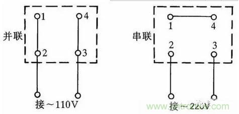 有的單相吹風(fēng)機(jī)引出4個(gè)接線端子,接線方法如圖5所示。采用并聯(lián)接法應(yīng)接入110V交流電源,采用串聯(lián)接法應(yīng)接入220V交流電源。