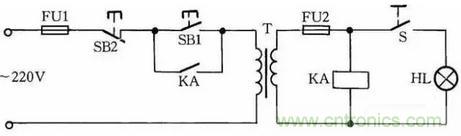 工作原理:閉合S后,按下按鈕SB1,變壓器得電輸出36V低電壓,使得繼電器或交流接觸器KA吸合。放松按鈕SB1后,KA自鎖觸點(diǎn)使KA保持吸合,繼續(xù)給變壓器接通電源。如果變壓器次級(jí)發(fā)生短路故障,繼電器線圈電壓為零,此時(shí)KA便失電釋放,將變壓器電源斷開,保護(hù)變壓器不被破壞。