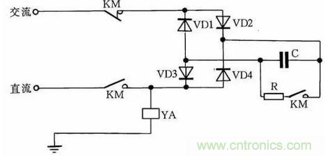 快速退磁的工作原理是:直流電磁鐵斷電后,交流電源通過橋式整流器和YA向電容C充電,隨著電容C兩端電壓的不斷升高,充電電流越來越小,而通過YA的電流又是交變的,從而使電磁鐵快速退磁。電容C的容量要根據(jù)電磁鐵的實(shí)際情況現(xiàn)場(chǎng)試驗(yàn)決定。R為放電電阻。