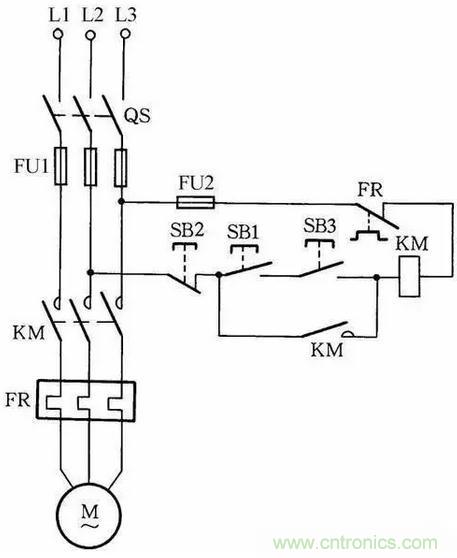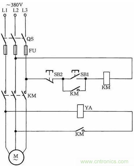 圖中SB2為停止按鈕,在停止時(shí),按動(dòng)SB2的時(shí)間要長一點(diǎn)。否則,手松開按鈕后,接觸器又吸合,使電動(dòng)機(jī)繼續(xù)運(yùn)行。這是因?yàn)殡娫措妷弘m被切斷,但由于慣性的作用,電動(dòng)機(jī)轉(zhuǎn)子仍然轉(zhuǎn)動(dòng),其定子繞組會(huì)產(chǎn)生感應(yīng)電動(dòng)勢(shì),一旦停止按鈕很快復(fù)位,感應(yīng)電動(dòng)勢(shì)直接加在接觸器線圈上,使其再次吸合,電動(dòng)機(jī)繼續(xù)運(yùn)轉(zhuǎn)。