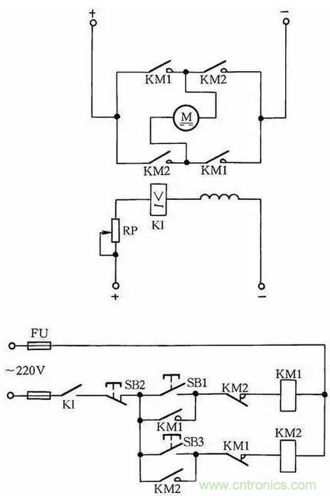 在勵(lì)磁電路內(nèi),串聯(lián)一個(gè)欠電流繼電器KI,其常開觸點(diǎn)接在控制電路中。當(dāng)勵(lì)磁電流消失或減小到設(shè)定值時(shí),KI釋放,KI常開觸點(diǎn)斷開,切斷電動(dòng)機(jī)電樞電源,使電動(dòng)機(jī)停轉(zhuǎn),從而避免超速現(xiàn)象發(fā)生,見圖11。