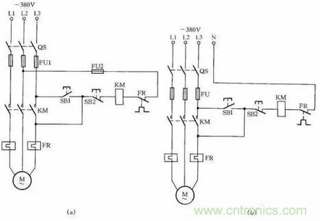 接觸器線圈電壓為380V時(shí),可按圖12(a)所示接線;接觸器線圈電壓為220V時(shí),可按圖12(b)接線。圖12(a)的接線還有缺陷,即在電動(dòng)機(jī)停轉(zhuǎn)時(shí),其引出線及電動(dòng)機(jī)帶電,使維修不大安全。因此,這種線路只能在應(yīng)急時(shí)采用,并在維修電動(dòng)機(jī)時(shí),應(yīng)斷開控制電動(dòng)機(jī)的總電源開關(guān)QS,這一點(diǎn)應(yīng)特別注意。