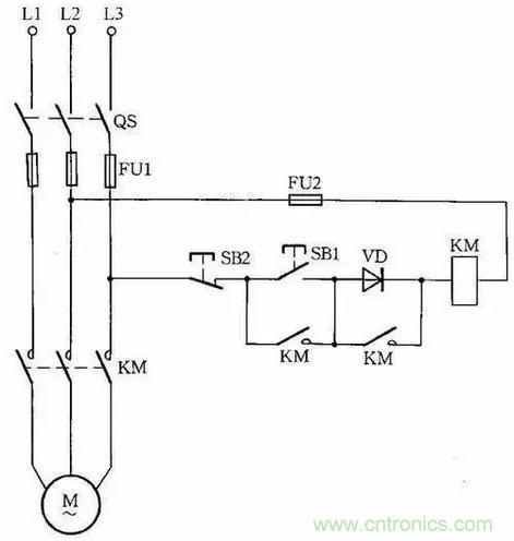 因?yàn)閱?dòng)電流較大,所以這種線路只適用于操作不頻繁的場(chǎng)合。線路中,VD應(yīng)選用耐壓大于700V的二極管,電流要根據(jù)交流接觸器線圈電流而定。