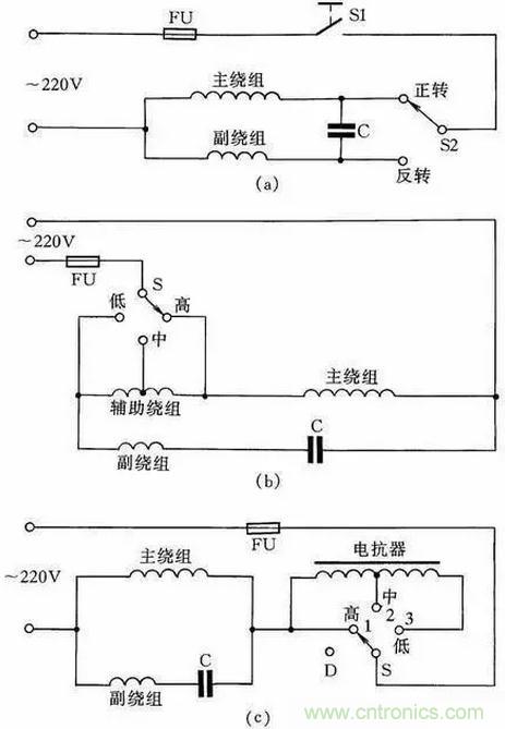 圖16(b)為帶輔助繞組的接線線路,撥動(dòng)開關(guān)S,可改變輔助繞組的抽頭,即改變主繞組的實(shí)際承受電壓,從而改變電動(dòng)機(jī)的轉(zhuǎn)速,此接線方法常用于電風(fēng)扇上。