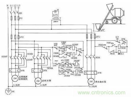 這時(shí)料斗已升到預(yù)定位置,把料自動(dòng)倒到攪拌機(jī)內(nèi),并自動(dòng)停止上升。此時(shí)操作人員按下下降按鈕2SBR時(shí),卷揚(yáng)系統(tǒng)帶動(dòng)料斗下降,待下降到其料口與地面平齊時(shí),擋鐵碰撞行程開關(guān)3SQ,使2KMR接觸器斷電釋放,自動(dòng)停止下降,為下次上料做好準(zhǔn)備,這時(shí)攪拌機(jī)料已備好,操作人員再按下3SB1,3KM接觸器得電吸合,使供水抽水泵電動(dòng)機(jī)3M運(yùn)轉(zhuǎn),向攪拌機(jī)內(nèi)供水,與此同時(shí),時(shí)間繼電器KT得電工作,待供水與原料成比例后(供水時(shí)間由KT時(shí)間繼電器調(diào)整確定,根據(jù)原料與水的配比確定),KT動(dòng)作延時(shí)結(jié)束,從而使3KM自動(dòng)釋放,供水停止。