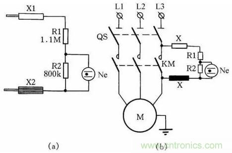如果絕緣電阻合乎標(biāo)準(zhǔn)(即絕緣電阻值大于0.5MΩ),則泄漏電流很小時(shí),在R2上的電壓降小于氖泡的點(diǎn)燃電壓,Ne不亮;當(dāng)任意兩相或三相同時(shí)對(duì)機(jī)殼的絕緣電阻降低時(shí),泄漏電流大增,使氖泡Ne點(diǎn)燃,從而可判定絕緣不合格。
