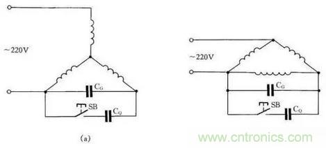 如圖19所示:圖(a)為Y形接法電動(dòng)機(jī)連接方法,圖(b)為△形接法電動(dòng)機(jī)連接方法。為了提高啟動(dòng)轉(zhuǎn)矩,將啟動(dòng)電容CQ在啟動(dòng)時(shí)接入線路中,在啟動(dòng)完畢后退出。