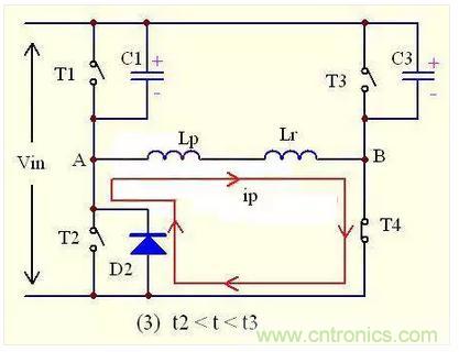 如上圖,此時(shí)T2與T3同時(shí)導(dǎo)通,T1與T4同時(shí)關(guān)斷,原邊電流ip的流向是T3—Lk—Lp—T2,如圖所示。