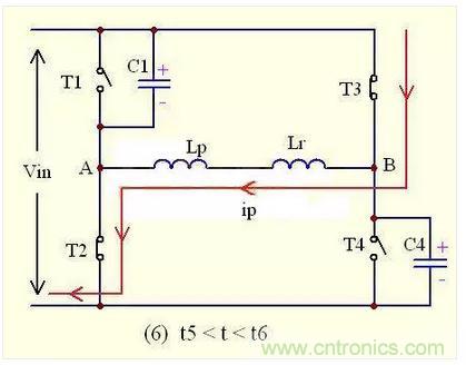 在t5-t6的時(shí)間內(nèi),副邊的二極管D1,D2還是同時(shí)導(dǎo)通流過(guò)電流,將副邊繞組短路,阻斷輸出電感反射到初級(jí)的途徑,此時(shí)的負(fù)載電流還是由次級(jí)電感與輸出電容提供;同時(shí),由于原邊的T2,T3已經(jīng)導(dǎo)通,原邊電流ip流過(guò)T3--Lr--T2,又因?yàn)長(zhǎng)r很小,所以原邊電流ip就會(huì)反向急劇增大。