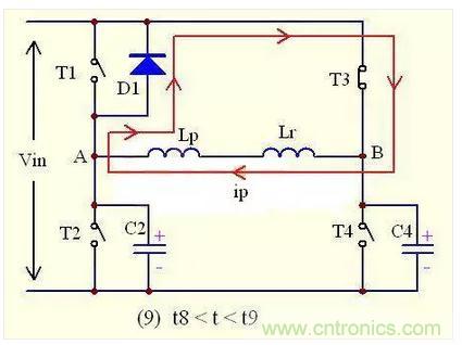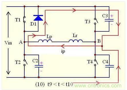 由于T3的關(guān)斷,原邊電流ip突然失去通路,但由電感的原理我們知道,原邊電流不允許突變,需要維持原來(lái)的方向,以一定的速率減少。所以,原邊電流ip會(huì)對(duì)C3充電,使C3兩端的電壓慢慢往上升,同時(shí)C4開(kāi)始放電。即 ip(t)=-I2sinω(t-t9)