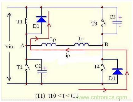 如圖所示,在t11時(shí)刻之前,T4已經(jīng)導(dǎo)通,在t11時(shí)刻原邊電流ip已經(jīng)上升到0,由于沒(méi)有了電流,所以D1,D4自然關(guān)斷。