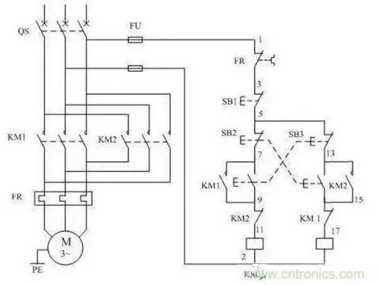 1、接觸器互鎖:KM1線圈回路串入KM2的常閉輔助觸點,KM2線圈回路串入KM1的常閉觸點。當(dāng)正轉(zhuǎn)接觸器KM1線圈通電動作后,KM1的輔助常閉觸點斷開了KM2線圈回路,若使KM1得電吸合,必須先使KM2斷電釋放,其輔助常閉觸頭復(fù)位,這就防止了KM1、KM2同時吸合造成相間短路,這一線路環(huán)節(jié)稱為互鎖環(huán)節(jié)。
