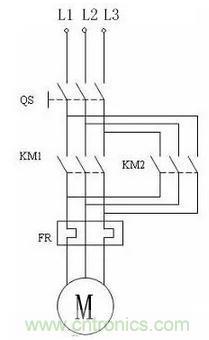 注意看KM1和KM2的相序,當接觸器常開觸點KM1閉合后,接在電動機上的相序是(從左至右)L1,L2,L3;當另一個接觸器的常開觸點KM2閉合后,接在電動機上的相序是(從左至右)L3,L2,L1。上文已經(jīng)說過了,改變相序就能改變電動機的轉動方向。因此,KM1閉合和KM2閉合,兩次電動機轉動的方向是相反的。