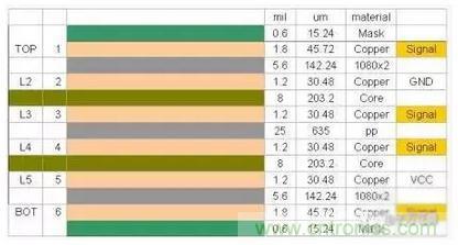 當制作某一特定厚度的印制板時,一方面要求合理地選擇各種材料的參數(shù),另一方面,半固化片最終成型厚度也會比初始厚度小一些。下面是一個典型的6層板疊層結構: