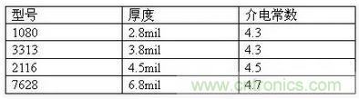 介電常數(shù):半固化片的介電常數(shù)與厚度有關,下表為不同型號的半固化片厚度和介電常數(shù)參數(shù):