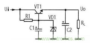 R1 同時(shí)還是 VD1 的限流保護(hù)電阻。在加入穩(wěn)壓二 極管 VD1 后,改變 R1 的大小不能改變 VT1 發(fā)射極輸出電壓大小,由于 VT1 的發(fā)射結(jié)存在 PN結(jié)電壓降,所以 發(fā)射極輸出電壓比 VD1 的穩(wěn)壓值略小。