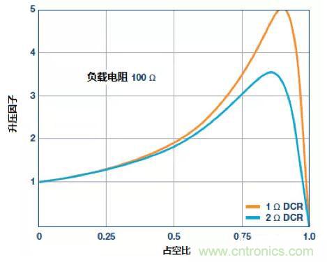 圖2中曲線的變化真實地顯示出輸出端負載電阻和電感的直流電阻的改變,對升壓因子造成的影響。假設(shè)負載電阻為100Ω,48V的輸出電壓,這對應(yīng)于負載電流480mA。當(dāng)電感的串聯(lián)電阻(DCR)只有2Ω,最大升壓因子是有可能剛好超過3; 但對于DCR為1Ω,略高于5的升壓因子是可以實現(xiàn)的。如要求更高的升壓因子,就必須選用具有更低的串聯(lián)電阻值的電感。