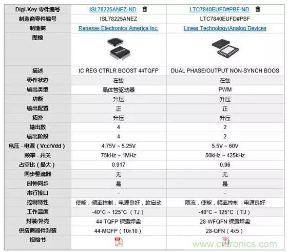例如在查找四相輸出升壓控制器時,得出Renesas公司的ISL78225ANEZ,再經(jīng)搜尋功能中“零件比較”的協(xié)助(如何比較?可訪問Digi-Key官網(wǎng)中「隱藏的搜索秘密」的零件搜索小技巧!)