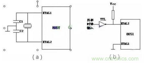 時鐘電路:(a)內(nèi)部方式時鐘電路,(b)外接時鐘電路