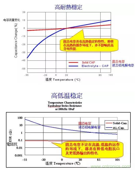 傳統(tǒng)電解電容比較容易受運用環(huán)境地溫度和濕度影響,在高低溫穩(wěn)定性方面稍差。即使是在零下攝氏55度至105度,固態(tài)電容地ESR電阻抗可以達到在0.1~0.3歐母,但電解電容則會因溫度而改變。