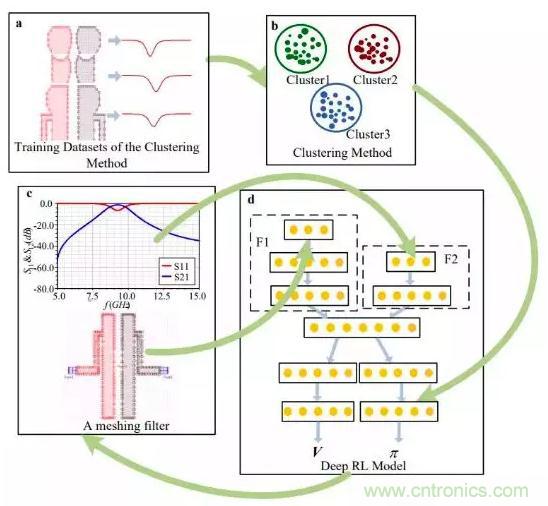 圖1:RINN架構(gòu)。a, 聚類算法的數(shù)據(jù)集,即網(wǎng)格模型的S參數(shù)變化矩陣。B,聚類算法。C、網(wǎng)格化的模型和S參數(shù)矩陣訓(xùn)練深度強(qiáng)化學(xué)習(xí)模型。d,以c為輸入,以動(dòng)作的概率向量π和價(jià)值標(biāo)量v為輸出的深度強(qiáng)化學(xué)習(xí)模型。