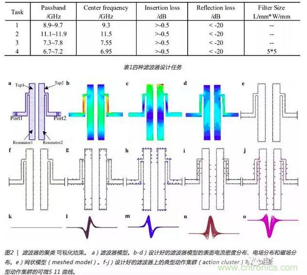 圖2 | 濾波器的聚類 可視化結(jié)果。a)濾波器模型。b-d)設(shè)計(jì)好的濾波器模型的表面電流密度分布、電場(chǎng)分布和磁場(chǎng)分布。e)網(wǎng)狀模型(meshed model)。f-j)設(shè)計(jì)好的濾波器上的典型動(dòng)作集群(action cluster)可視化結(jié)果。k-o)典型動(dòng)作集群的可微S 11 曲線。