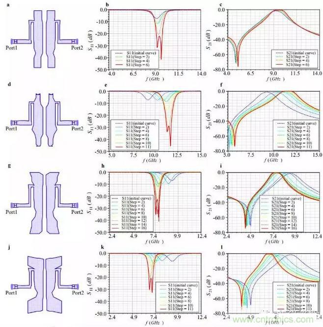 第二項(xiàng)任務(wù)和第三項(xiàng)任務(wù)的AI首先學(xué)會(huì)調(diào)整諧振器的長(zhǎng)度,以達(dá)到移動(dòng)中心頻率的目的,然后調(diào)整諧振器之間的耦合系數(shù),以減少通帶回波損耗,增加插入損耗,其設(shè)計(jì)過(guò)程如圖3(d-i)所示。