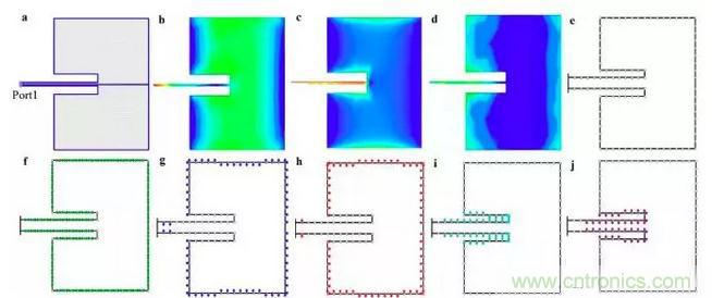 圖4:天線的聚類可視化結(jié)果。a,天線模型。b,表面電流密度分布。c,磁場(chǎng)分布。d,電場(chǎng)分布。e,Meshed模型。f-j,網(wǎng)格頂點(diǎn)聚類的可視化結(jié)果。